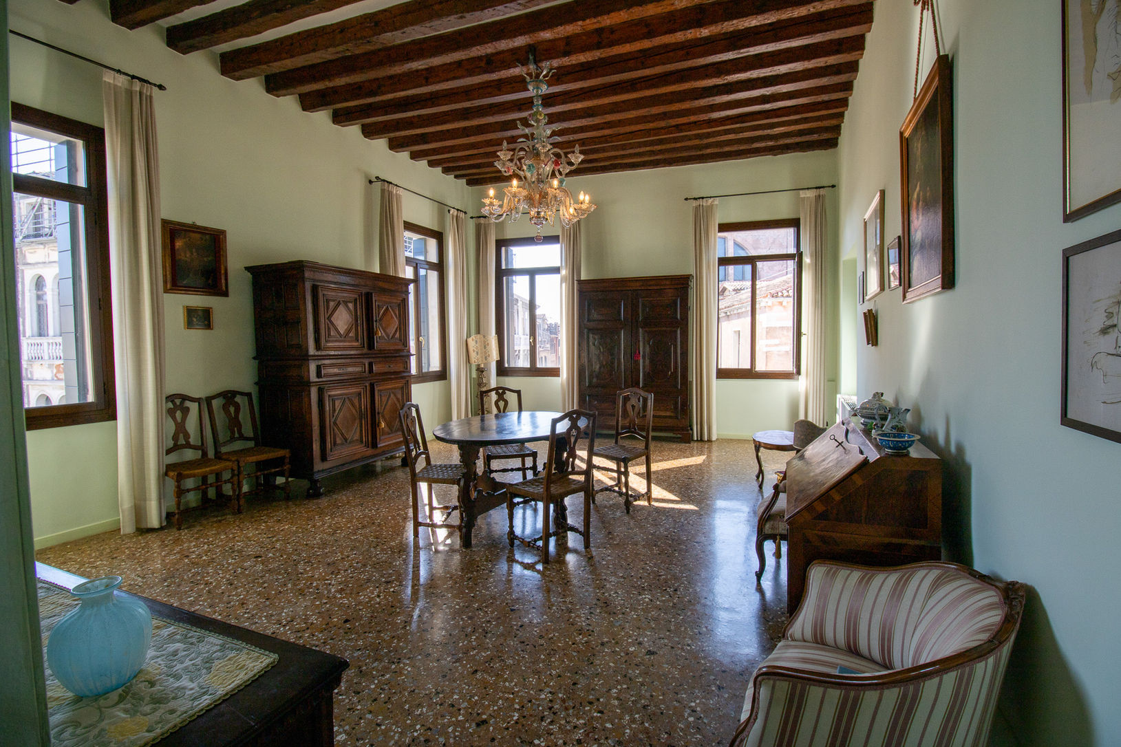 Le point fort de l’appartement est son vaste salon noble, avec poutres apparentes et sols en terrazzo vénitien, baigné de lumière grâce à quatre grandes fenêtres donnant sur un croisement de canaux — une vue rare et d’une grande beauté.