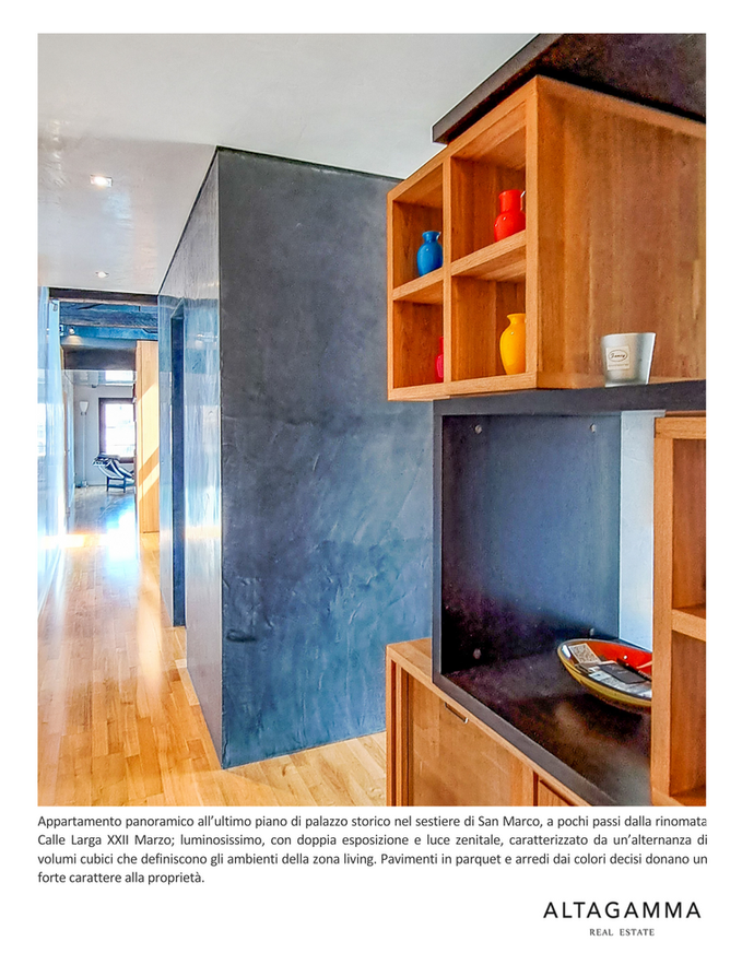 rinomata Calle Larga XXII Marzo e da Piazza San Marco; luminosissimo, con doppia esposizione e luce zenitale, caratterizzato da un’alternanza di volumi cubici che definiscono gli ambienti della zona living impreziositi da elementi d'arredo di design iconici. Composto da ingresso, ampio soggiorno d'angolo con vista su rio e campanile di San Marco, doppia sala da pranzo, cucina professionale separata, una suite costituita da camera da letto matrimoniale, stanza guardaroba, palestra e bagno con grande vasca, seconda camera con bagno en suite, soppalco con stanza polifunzionale. Magazzino di pertinenza al piano terra. Porta d'acqua condominiale.