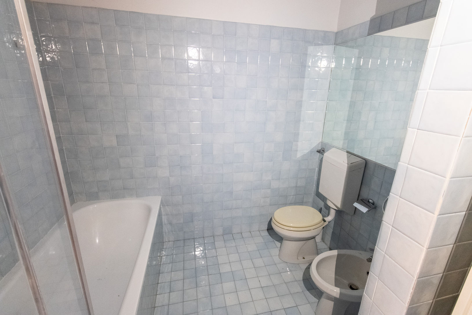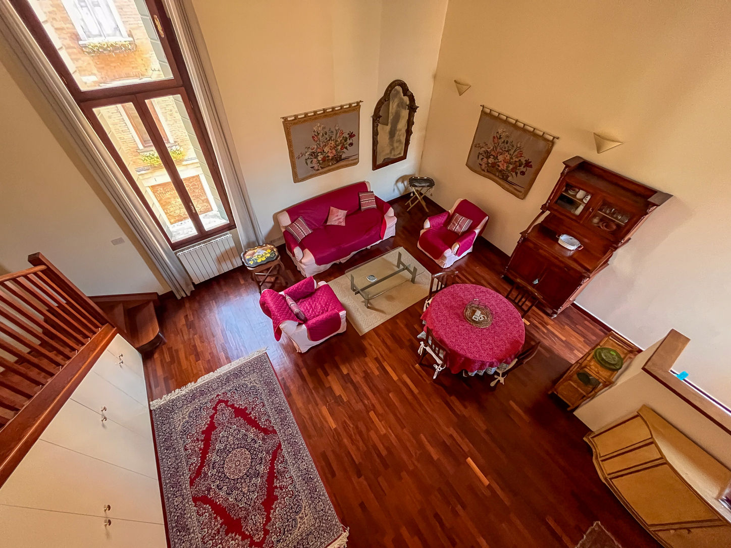 The 65 sqm apartment comprises: entrance hall, small sitting room, and guest bathroom with laundry area. Through a majestic Gothic doorway, you enter the spacious and bright living area featuring a sofa lounge, open-plan (American-style) kitchen, and dining area, overlooking the private courtyard.